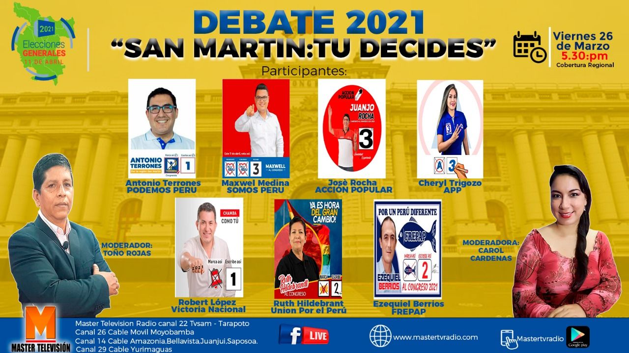 ESTE VIERNES 26 DE MARZO DEL 2021 DESDE 5 Y 30 PM POR NUESTRA SEÑAL SE TRANSMITIRÁ EL DEBATE CONGRESAL DEL AÑO, SIETE CANDIDATOS AL CONGRESO EXPONDRÁN SUS PROPUESTAS EN TEMAS DE : 1. SEGURIDAD CIUDADANA 2. MEDIO AMBIENTE 3. EDUCACIÓN - VIRTUAL 4. ANTICORRUPCIÓN Y JUSTICIA 5. SALUD PÚBLICA 6 ECONOMIA Y EMPLEO 7. AGRO Y SERVICIOS BÁSICOS COBERTURA REGIONAL EN VIVO EN : SAN MARTIN- TARAPOTO CANAL 22 Y 3.4 TDT - TVSAM ALTOMAYO - MOYOBAMBA CANAL 26 CABLE MÓVIL BELLAVISTA-JUANJUI-SAPOSOA- CANAL 14 CABLE AMAZONIA ALTOAMAZONAS - YURIMAGUAS CANAL 29 CABLE YURIMAGUAS WEB VIVO: WWW.MASTERTVRADIO.COM FACEBOOKLIVE Y OTRAS PLATAFORMAS DIGITALES.....