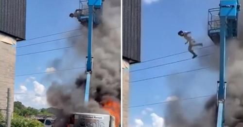 Las llamas y el humo negro que emanaban desde la base hiso que el trabajador no pudiese descender, por lo que bomberos locales utilizaron una carpa para que el trabajador saltara desde una altura de 25 pies sobre ella.